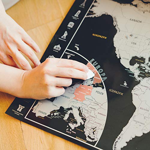 ???? ALLES AUF DEUTSCH Der Weg ist das Ziel, daher geben wir Euch diese magische XL Weltkarte zum Freirubbeln an die Hand. Kinderleichter Rubbelspaß für die ganze Familie in den Ausmaßen 82 x 42 cm. ???? EUROPA ZOOM Kleines Europa ganz groß. Mit Hilfe der EU Vergrößerung auf der Scratch Map hast Du deine EU Reisen genauer im Blick.. ????WAHRZEICHEN Rubbelkarte für Reisejunkies, die schon alles gesehen haben oder noch sehen wollen: Einfach freirubbeln und dem Familien-, Freundes- und Bekanntenkreis berichten, welche fantastischen Sehenswürdigkeiten von euch schon bereist wurden.. ???? EINZIGARTIGES DESIGN Diese Rubbel Weltkarte gibt es exklusiv nur bei uns! Das Poster wurde liebevoll in Deutschland entwickelt, welches dein Büro oder Zuhause stilvoll aufwertet.. ???? DIE PERFEKTE GESCHENKIDEE ...zum Auslandssemester / Auslandsjahr, Geburtstag, Weihnachten oder anderen Anlässen für alle Globetrotter, Vielreisende und Weltenbummler.