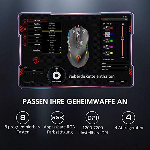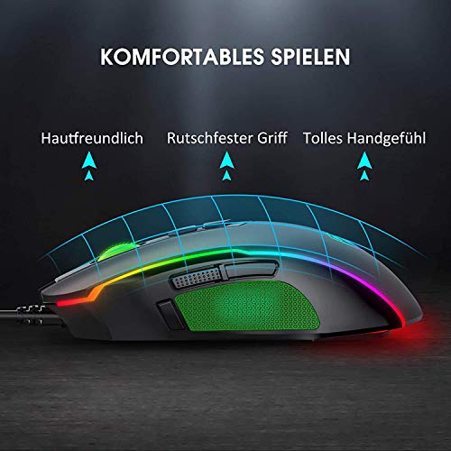 ?Max. 7200 DPI & 4 Polling Rate?Beidhändige Gaming Maus mit 5 Standard & 4 DPI, während des Spiels kann zwischen 5 verschiedenen DPI-Wert von 1200 bis 7200 DPI gewechselt werden, Standard DPI: 1200 (rot) / 2400 (blau) / 3500(grün) / 5500 (violett) / 7200 (gelb). Sie können auch durch Software DPI-Wert 500 7200 einstellen. Durch den präzise Spensor und die bis zu 1000Hz Polling-Rate werden die stockende Mausbewegungen einstellbar verhindern.. ?Programmierbare 8 Tasten inkl. Feuer-Taste?Mit programmierbaren 8 Tasten können Sie beliebige Eigenschaften einfach definieren. Im Vergleich zu den allgemeinen Gaming Maus gibt Holife RGB Gaming Mouse eine Feuer-Taste (für bis zu 3 Schüsse mit einem Klick). Die Holife Maus Gaming ist geeignet für FPS?CounterStrike usw. (inkl. CD-Treiber) *Keine Funktion der Programmierung unter IOS/MAC (Apple). ?Mit 16, 8 Millionen RGB Farbe?Holife RGB Gamer Maus kann mit bis zu 16, 8 Millionen Farben abgestimmt werden. Die bunte Hintergrundbeleuchtung kann man in eine große Spielatmosphäre holen, sehr cool! (Drei RGB-Modus-Optionen: Ripple, Neon-Modus und Flowing. ) Holife RGB-Hintergrundbeleuchtung Gaming-Maus bringt Sie nachts zum Genuss. Können Sie auch die bunte Hintergrundbeleuchtung durch untere Taste ausschalten, wird tiefen Schlaf nicht stören, geeignet für Büro und Zuhause.. ?Reaktionsschnellster optischer Sensor?Die Laser-Technologie bei dieser Holife RGB Wired Maus sorgt für höchste Präzision und beste Abtastraten (einstellbare Abfragerate: 125Hz / 250Hz / 500Hz / 1000Hz). Fortschrittliches Maus-Chip und Spielprogramm ist geeignet perfekt für Gamer (Polling Rate mit 1000 Hz|Beschleunigung mit 10g|4000FPS).. ?Beidhändige Design & lange Lebensdauer?Diese Maus mit komfortables ergonomisches Design, um Tendinitis am Handgelenk zu verhindern. USB Gaming Mouse mit ergonomischem beidhändigm Design, dass sowohl für Rechtshänder als auch für Linkshänder geeignet ist. Die Seitenknöpfe sind ausschließlich auf der linken Seite, es bietet ein angenehmes Gefühl. Und Holife Optisch Gaming Mouse wurden einer ganzen Reihe von Tests unterzogen.