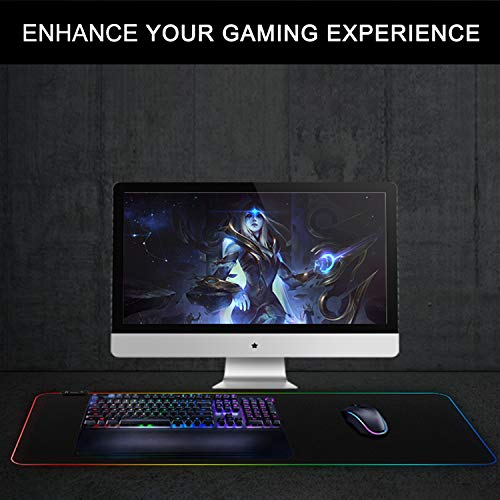 ?14 RGB-Beleuchtungs-modi? Das Reawul RGB-Gaming-Mauspad verfügt über 14 RGB-Beleuchtungs-modi, darunter Rot, Blau, Grün, Lila, Cyan, Gelb, Weiß, Wechselwelle, Synchronisationswelle, Wechselblitz, Wechselrotwechsel, Licht aus, Atmung synchronisieren. Alternierendes Atmen bietet die visuelle Betäubung von Farben und Effekten.. ?Einfach zu bedienen?Plug and Play. Dieses RGB-Mauspad mit Hintergrundbeleuchtung wird über USB mit Strom versorgt und funktioniert ohne Treiber. Es gibt zwei Steuertasten. Eine dient zum Ein- und Ausschalten und eine zum Ändern der RGB-Beleuchtungsmodi und der Helligkeit.. ?Entwickelt für Spiele?Die Oberfläche besteht aus superfeinem, geflochtenem Material, bietet eine ultra glatte Oberfläche und eine präzise Mauspositionierung. Die Basis des Mauspads besteht aus weichem, rutschfestem Gummi, das den Desktop fest in der Hand hält und eine überragende Stabilität auf dem Schreibtisch bietet. So können Sie die ultimative Präzision im leidenschaftlichsten Spiel genießen.. ?Große Größe? Die Größe von 800 x 300 mm passt perfekt zu Ihrer Maus und Tastatur und bietet dennoch viel Bewegungsspielraum. Gilt für alle Arten von Tastaturen und Mäusen und bietet viel Platz für professionelles Spielen oder Büroarbeiten.. ?Was Sie bekommen?Reawul 14 Modi RGB-Gaming-Mauspad, 6 Fuß Micro-USB-Kabel, Bedienungsanleitung.