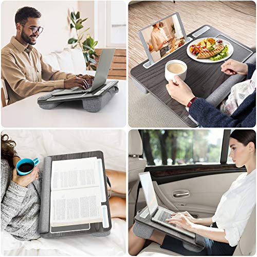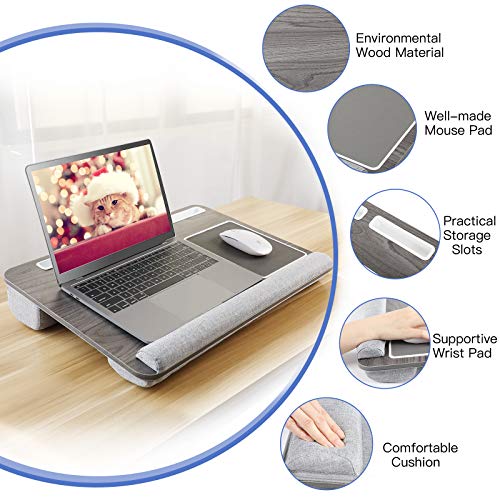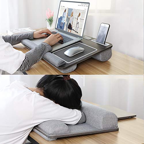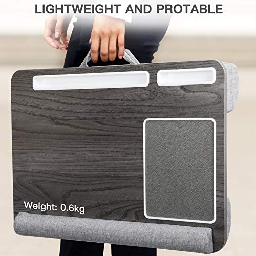 Multifunktionaler Laptopständer - Dieser Laptoptisch besteht aus einer umweltfreundlichen Holzplatte und 2 Kissen für Komfort und Halt. Es kann auf dem Bett, auf dem Sofa oder auf Reisen verwendet werden. Sie können es als Lapdesk, Arbeitsständer, Lesetisch, Notebookständer oder für jede Situation, die Sie benötigen, verwenden. Hilft, Platz zu sparen - Das Kissentablett ist mit einem Tablet-Halter, einem Stifthalter und einem Telefonhalter ausgestattet, sodass Sie alles an einem Ort haben und dadurch Platz sparen können. Sie können ganz einfach Ihr Telefon, Stift oder Tablet in den dafür vorgesehenen Steckplatz stecken, um Ihre Geräte auf eingehende Nachrichten / Anrufe zu überwachen, während Sie auf Ihrem Laptop arbeiten oder ein Buch lesen. Komfortables und sicheres Design - Die Handgelenkauflage bietet eine bequeme Position, in der Sie Ihr Handgelenk platzieren und gleichzeitig verhindern können, dass der Computer abrutscht. Das Mauspad verbessert Ihre Arbeitseffizienz. Die Doppelsitzkissenbasis passt sich Ihrem Schoß an, bietet mehr Komfort und hält den Laptop in einem bequemeren Winkel. Leicht & Tragbar - Unsere Laptop Unterlage ist extrem leicht und verfügt über einen Griff, mit dem Sie ihn mit einem Finger von Ort zu Ort tragen können. Nehmen Sie es auf Reisen mit, gehen Sie zu Ihren Freunden oder zur Arbeit. Verlieben das einfache Leben - Der Notebook Ständer besteht aus einer glatten Holzplatte, die Ihnen eine stabile Oberfläche bietet. Die Holzmaserung unterscheidet sich von anderen Produkten und wirkt eleganter und schöner