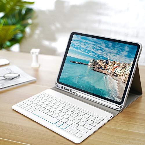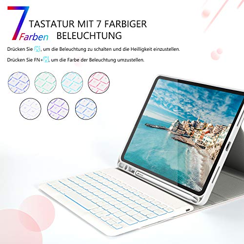Kompatibel mit 2 Modell - Diese Hülle mit Tastatur wurde speziell für iPad Pro 11 "2018 (1. Generation) (A1934 / A1979 / A1980) und das iPad Pro 11 2020 (2. Generation) (A2228 / A2231 / A2230 / A2068) entwickelt. Die Hülle schützt Ihr iPad mit elegantem Design vor Kratzern und Fallen.. Tastatur beleuchtet & wiederaufladbar & abnehmbar - bei der Bluetooth Tastatur ist 7-farbigen Beleuchtung verfügbar, 3 Helligkeit-Stufen lassen sich einstellen. Mit einer großen Kapazität von 650mAh ermöglicht die Tastatur eine Arbeitszeit bis zu 220 Stunden ohne Beleuchtung, 6 Stunden mit Beleuchtung.. Hülle aus TPU Material - die Hülle besteht aus TPU Material, das sanfter und langlebiger als Plastik ist. Mit dem können Sie Ihr iPad einfach in die Hülle einziehen und leicht davon ausziehen, ohne Ihr Tablet zu beschädigen.(ACHTUNG: die Hülle an der Ecke der Kamera ist nicht 100% fest geklebt. So ist das Design). Leiser & bequemer Eingeben - die Tasten der kabellosen Tastatur sind mit Scherenfuß hergestellt. Es schwindet wirksam Geräusch bei Eingabe. Für eine angenehme ruhige Umgebung in Büro oder zuhause geeignet.. Pencil Halter & Aufladung Funktion - Die Hülle ist mit einem Halter für Pencil ausgestattet und unterstützt die kabellose Ladefunktion von Apple Pencil.