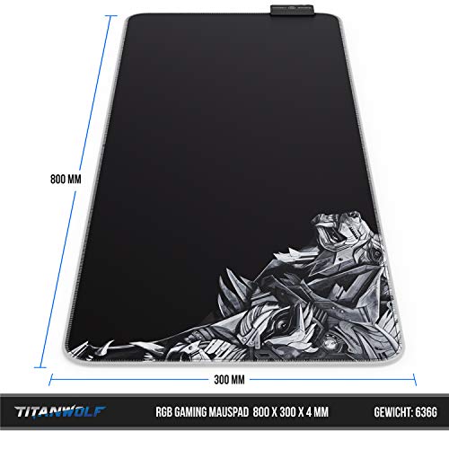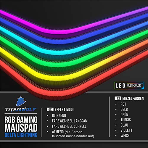 Genieße atemberaubende Farben und Effekte auf Deinem Schreibtisch! Das 800 x 300 mm große Mauspad lässt sieben kräftige RGB-Farben aufleuchten. Deine Freunde werden staunen. Schließe das Mauspad einfach über das beigefügte USB-Kabel an Deinen Rechner an und genieße die Illumination. Der Hingucker auf jeder LAN-Party! | 303675. Tasterfunktionen: Mit dem Taster schaltest Du sieben Einzelfarben durch: Rot, gelb, grün, türkis, blau, violett und weiß. Wenn Du weiterdrückst, kommst Du zu den Effektmodi: „atmende“ Farben (die Farben leuchten nacheinander auf) | zufälliger Farbübergang: langsam und schnell | blinkend (zufällige Reihenfolge). Wähle ganz einfach Deinen Favoriten!. Die glatte, mikrostrukturierte Stoffoberfläche stellt genau den Gleitwiderstand zur Verfügung, um die Maus präzise zu führen. | Das Leuchtband ist sorgfältig eingenäht und wird Dir über viele Jahre hinweg Freude bereiten.. Mit der rückseitigen Gummierung bleibt das Pad an Ort und Stelle, selbst auf Glas und bei hektischen Spielbewegungen.. Kombiniere das Mauspad mit den leuchtenden Tastaturen und Gamingmäusen von Titanwolf und erlebe das Zusammenspiel aller Farben!