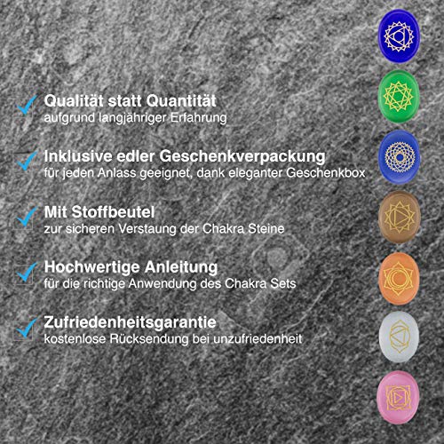 NATÜRLICHE HEILMETHODE – Unser Chakra Set besteht nur aus unbehandelten Naturreinen Steinen. Dies bedeutet die Edelsteine sind nicht mit Öl oder Wachs behandelt worden. Da durch bieten wir eine Natürliche Heilmethode für viele Anwendungsbereiche unter anderem für: Chakra Therapie, Meditation, Reiki, Energiearbeit, Auratherapie und andere alternative Heilmethoden. THERAPIE UND BLOCKADEN - Anfänglich für die Therapiearbeit angedacht haben wir diese Kristalle erschaffen, um den Menschen ein Instrument an die Hand zu geben, mit dessen Hilfe er die entsprechenden Chakren aktivieren und dadurch energetische Blockaden auflösen kann.. BEDACHTE AUSWAHL – Wir wollen dir nur das Beste bieten mit unserer bedachten Auswahl von den unterschiedlichsten Chakra Steinen haben wir 7 der beliebtesten Heilsteine ausgewählt: Bergkristall (Kronen Chakra), Amethyst (Drittes Auge Chakra), Lapis Lazuli (Hals Chakra, Grüner Aventurin (Herz Chakra), Gelbe Jade (Solarplexus Chakra), Karneol (Kreuz Chakra) und Rotes Tigerauge (Wurzel Chakra). HOHE QUALITÄT UND HANDFERTIGUNG – Durch Jahrelange Erfahrung haben wir die Qualitätsstandarts für die Chakra Steine weiterentwickelt. Die Heilsteine unterliegen strengen Kontrollen und sind handverlesen. Majvi steht für Qualität und diese bringen wir unseren Kunden nicht nur durch unsere Chakra Set hinzu, sondern auch durch unseren Service. Antwort auf all deine Fragen, einfach und unkomplizierte Rücknahme und ein einmaliges Einkaufserlebnis.. PREMIUM QUALITÄT – Über das Chakra Set freut sich garantiert jeder. Egal ob zum Geburtstag, Hochzeitstag, Weihnachten oder einen anderen Anlass. Dank der schicken Geschenkbox landest Du immer einen Volltreffer!