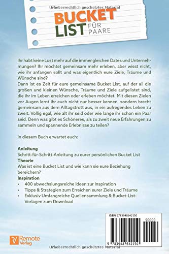 Bucket List für Paare: 400 Erlebnisse für eine abwechslungsreiche, entspannte und glückliche Beziehung 14.99 EUR ... [mehr] Zur Wunschliste hinzufügen Auf Wunschliste Zum Anbieter