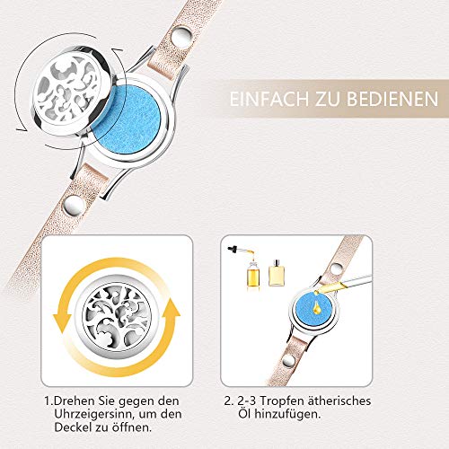 ?Hochwertige Materialien -- Das Medaillon besteht aus hypoallergenic 316L Edelstahl für empfindliche Haut. Das Armband ist aus hochwertigem Leder gefertigt und hat eine lange Lebensdauer.. ?Perfekte Geschenkeidee -- Ein kreatives Geschenk mit schönem Design und Aromatherapie Funktionen. Das Duft Armband kommt mit einer schönen Geschenkbox. Als Geburtstagsgeschenk, Weihnachtsgeschenk, Valentinstagsgeschenk, Muttertagsgeschenk, Feiertagsgeschenk, geeignet für Frau, Mutter, Freunde, Mädchen, Kollegen. ?8 Stk. Filz-Pads -- Das Aromatherapie Armband kommt mit 8 Stk. waschbare und wiederverwendbare Filz-Pads mit verschiedenen Farben, um alle Kleidungsstücke abzugleichen. Sie können auch Filz -Pad wählen, um die verschiedenen Düfte zu verändern. Sodass Ihr Armband anders aussieht.. ?Einfach zu bedienen und reinigen -- Drehen Sie gegen den Uhrzeigersinn, um den Deckel zu öffnen. Tropfen Sie 2-3 ätherisches Öl oder Parfüm auf das Pad. Machen Sie die Abdekung zu. Entfernen Sie einfach das Pad zum Reinigen und wischen Sie das Medaillon vorsichtig mit Alkohol ab. Spülen Sie das Filzpad mit kaltem Wasser ab und lassen Sie es trocknen.. ?Einstellbare Länge -- Das ist ein Duftarmband mit Doppel-Lap. Der Aroma Armreif hat 6 Löcher, die wie eine Uhr je nach Größe des Handgelenks eingestellt werden können. Bei der Auswahl eines Geschenks müssen Sie sich keine Sorgen mehr darüber machen, ob Sie die Größe nicht kennen.