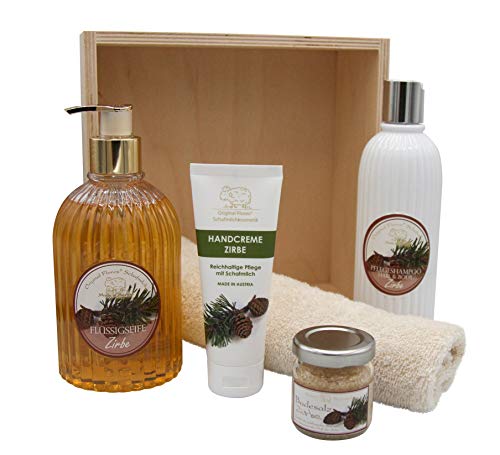 ? PERFEKTES Geschenk für jede Frau! Die Kombination aus Badesalz, Seife, Handtuch, Handcreme & Shampoo sorgt für eine Rundum-Wohlfühlgarantie!. ? HANDGEFERTIGTE, liebevolle Qualitätsprodukte aus österreichischer Familienhand vereint in einer originellen Geschenkbox. ? BIOLOGISCHE Schafmilch als wichtiger Bestandteil unserer Produkte - trägt zur Stabilisierung des natürlichen Säureschutzmantels und der Hautschutzbarriere bei. ? HERGESTELLT zu 100% in ÖSTERREICH mit hochwertigen Inhaltsstoffen! Ohne Parabene, ohne Silikone, ohne Erdöl & ohne Palmöl. ? PURE Entspannung durch den Duft der Zirbe! Verwöhnen Sie sich und die ganze Familie mit diesen Anti-Stress-, Wellness- & Wohlfühlprodukten!