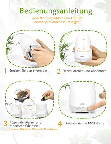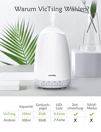 ?SPEZIELL ENTWICKELTER SCHLAFMODUS - Ein einziger Druck auf die SLEEP Taste, ein Modus ohne Licht und eine geringe Nebelabgabe (15-30ml / h), wird Ihren süßen Traum perfekt begleiten. Im Schlafmodus kann dieser ätherische Aroma Vernebler für 5-9 Stunden arbeiten, keine Sorge, Wasser nachts nachzufüllen.. ?LÄRMERDUZIERUNG DESIGN - Ausgestattet mit der einzigartigen schalldämmenden Abdeckung kann das Geräusch unter 21 dB gesteuert werden, um eine ruhigere Schlafumgebung zu schaffen. Dieser Raum Diffuser läuft so leise, dass Sie ihn kaum bemerken. Ideal für Schlafzimmer, Wohnzimmer, Büro, Spa, Yoga.. ?GRÖßERE & HÖHERE MIST - Dieser Aromatherapie-Diffuser liefert größeren und höheren Nebel als andere Marken und fügt mehr Duft hinzu. 2 mal schneller, um den Raum mit Ätherischesöl Öl Duft zu füllen als andere. Der diffuser luftbefeuchter kann kontinuierlich bei 25-40ml / h für 4-6H arbeiten und erzeugt viel mehr kühlen und parfümierten Duftöle Lufterfrischer.. ?BPA-FREI & WASSERLOS AUTO-OFF - Dieser Aroma öl Diffuser Hergestellt aus BPA-frei Materialien, ist es ungiftig und sicher für Babys. Wenn das Wasser erschöpft ist, wird die Maschine automatisch abgeschaltet. Sie müssen sich keine Gedanken darüber machen, das Gerät selbst zu beschädigen oder eine Gefahr für den Benutzer darzustellen. ?3H TIMER EINSTELLUNG & 8 FARBEN LED - Dieser Ätherische Öle diffuser luftbefeuchter Enthält eine separate TIMER-Taste, mit der Sie die gewünschte Nebelzeit-3 Stunden einstellen können. Drücken Sie die LIGHT-Taste, um von einer Farbe zur nächsten zu wechseln, Verwendet als ein perfektes Nachtlicht, hilft Ihnen, einen erholsamen Schlaf zu bekommen.