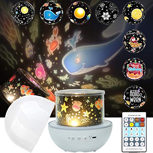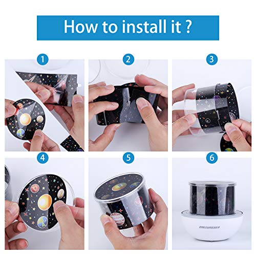 Beleuchtung mit IR Fernbedienung: Die 24 Tasten-Fernbedienung funktioniert in 3 Metern( Sehr gut), in 5 Metern(Ausreichend). Eine Knopf Batterie CR2025 ist schon in der Fernbedienung eingebaut. Außerden liefern wir auch eine zusätzliche Batterie als Ersatz im Notfall. Achtung: Bevor Sie die Fernbedienung verwenden, bitte entfernen Sie die Plastikfolie zuerst. 8 Projektionsmuster: Es geht um 8 verschiedene Themen, Halloween, Weihnachten, Mond&Sterne, Konstellationen, Geburtstag, Schneeflocken, Planeten des Sonnensystems und Meereslebewesen. Projektionsteil ist ein Zylinder. Alle Projektionsmuster bestehen aus Obenteil( rundem Muster) und Seitenteil (Vierechtem Muster). Tasten-Funtkionen: Einschlaten( Drücken Sie die Taste 2s ein-/auszuschalten), Taste für Drehung(kurzes Drücken - Das Gerät dreht sich Gegen den Uhrzeigersinn ; Langes Drücken – Timer für 30min wird aktiviert. Rote Anzeigelicht blinkt), Taste für Musik( 8 Unterhaltungsmusik sind auswählbar). Außerdem wird die im Gerät eingebaute Li-Batterie via USB Anschluss aufgeladen. Als Nachtlichter mit Musik: Wird der Zylinderrahmen entfernt und nur Lampenschirm montiert, dann bekommen Sie eine Lampe mit 4 Farben in Kaltweiß, Warmweiß, Blau oder Bunt. Die heilligkeit lässt sich in 10%, 25%, 40%, 55%, 70%, 85% und 100% einstellbar. Sie können ruhig Bücher/ Magazine lesen oder mit der Musik Müdigkeit lindern. Gutes Geschenk für Erwachsene und Kinder: Sicherheit- Feuerfeste Materialien( ABS und PC), die nicht angezündet werden können. Die Leistung beträgt nur 1 Walt- Energie sparen und Umweltfreundlich. Verschiedene Projektionsthemen befüllen die Bedürfnisse verschiedener Altersgruppen
