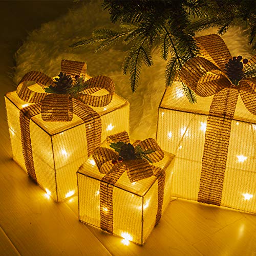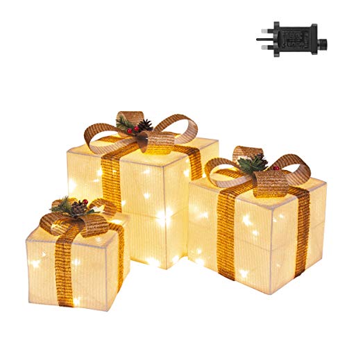 TOLLE DEKORATION MIT 8 LICHTMODI: Setzen Sie mit dieser schönen LED Geschenk Boxen mit goldener Schleife für stimmungsvolle Licht-Akzente im Wintergarten, Fenster, als Raumdekoration oder unter dem Weihnachtsbaum. Durch Steuertaste am Stecker stehen Ihnen 8 Lichtprogramme zu Verfügung. SICHER ZU BENUTZEN: Mit einem GS, CE zertifizierten Netzteil ausgestattet, bleibt diese Geschenkboxen bei einer sehr geringen Spannung (4.5V DC) 220-240V AC. Keine Überhitzung nach vielen Stunden und ist somit für Ihre Kinder und Haustiere sicher. HOCHWERTIGES MATERIAL: Das Paket besteht aus einem Drahtgestell, welches mit glänzendem Stoff verkleidet und mit einer stilisierten Schleife versehen ist, und wird im Inneren mit 45 LEDs beleuchtet, wodurch ein angenehme Licht-Akzente verzaubert wird. VIELE EINSATZMÖGLICHKEITEN: Die Geschenkbox hat eine Größe von 12,5 * 12,5 * 15 cm und ein Zuleitungskabel mit einer Länge von ca. 5m, erlaubt Ihnen eine flexible Platzierung der Geschenkwürfel. PRODUKT GARANTIE: 30-Tage Geld-zurück und 12-Monate Produkt Garantie ist immer dabei, so können Sie mit Vertrauen kaufen