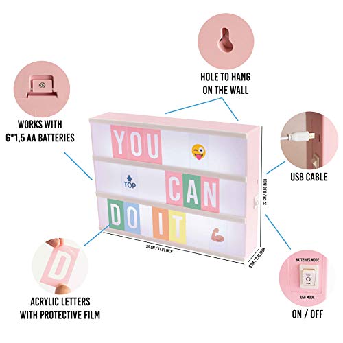???? 210 BUCHSTABEN & 90 EMOJIS ???? Mit 105 rosa Buchstaben, 105 farbige Buchstaben und 90 Emojis. Mit unserer Led Box werden Sie nichts verpassen. Für eine kreative Botschaft verwenden Sie die Buchstaben inkl. Ä, Ö, Ü und ß! Bis zu 10 Buchstaben passen in jede Reihe! Besser als andere mit nur 8-9. Tolles Geschenk für Geburtstage und Weihnachten für Mädchen 4, 5, 6, 7, 8, 9, 10, 11 und 12 alt. ???? 2 STIFTEN UND 30 TRANSPARENTEN KARTEN ???? Geben Sie Ihren Nachrichten eine besondere und persönliche Note, indem Sie auf transparente Karten mit den mitgelieferten roten und blauen Stiften schreiben. Zweifellos ein lustiges und originelles Geschenk zur Förderung der Kreativität, pink Leuchtbox mit Buchstaben ideal als Geschenk zum Geburtstag und zu Weihnachten. ???? SEHR LEICHT ANZUWENDEN ???? Diese Led Schild läuft mit 6 x AA Batterien (nicht dabei) oder mit mitgeliefertem 1.5 m USB-Kabel. Karten einschieben und Ihre Geburtstagsfeier, Babyparty, Hochzeit, Jubiläum oder andere Events schmücken. ???? VERLIEREN SIE IHRE BUCHSTABEN NICHT ???? Mit unserer Leuchttafel mit Buchstaben gibt 2 Umschläge zur Aufbewahrung der Karten! So werden Sie keine verlieren oder zerkratzen oder durcheinander kommen. Unser Leuchtkasten kommt auch mit einer hübschen Verpackung als Geschenk. ???? FEMININE ATMOSPHERE ???? Diese pink Lightbox mit Buchstaben und einem gedimmten LED-Licht ist perfekt, um Ihrem Zimmer, Haus, Büro, Geschäft oder andere Orte, die Sie dekorieren möchten, eine feminine Note zu verleihen. Dieses Lichtzeichen ist Ihre perfektes Gerät, um Ihre eigene Botschaft zu personalisieren
